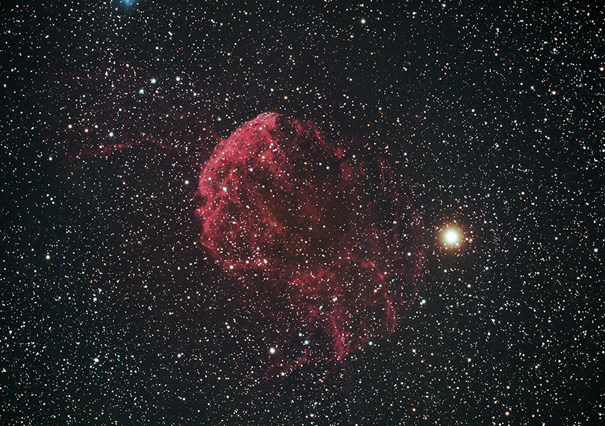 ふたご座の双子の兄弟、カストルの足元にある超新星残骸です。すぐ近くにはM35という散開星団もあります。非常に淡い天体で、天体写真の中でも難物です。昨年の12月頃からねらっていたのですが、納得した画像が得られず、時間と労力だけを無駄に費やしてしまいました。